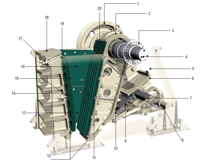LCC 系列顎式破碎機都裝備有雙楔塊排礦口調(diào)整系統(tǒng),其堅固且調(diào)整快捷的優(yōu)勢在行業(yè)內(nèi)已經(jīng)得到證明,該系統(tǒng)在對于由于供電中斷導(dǎo)致系統(tǒng)帶負載停機而需要清腔時尤其有效;橡膠減震裝置和限位塊可以吸收震動峰值載荷,并允許破碎機垂直和縱向位移,從而有效地降低破碎機對基礎(chǔ)的沖擊;電機機座與破碎機機架一體安裝,減少了破碎機安裝空間和 V 形帶的長度。